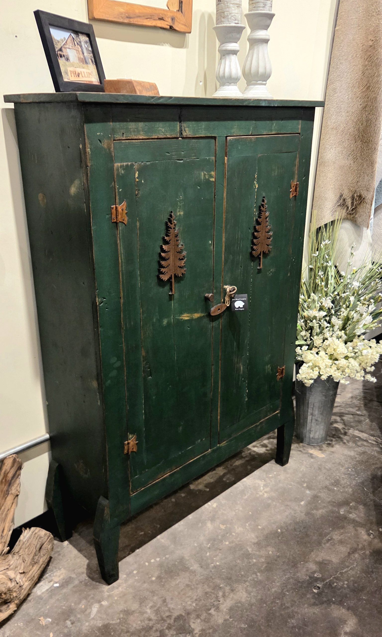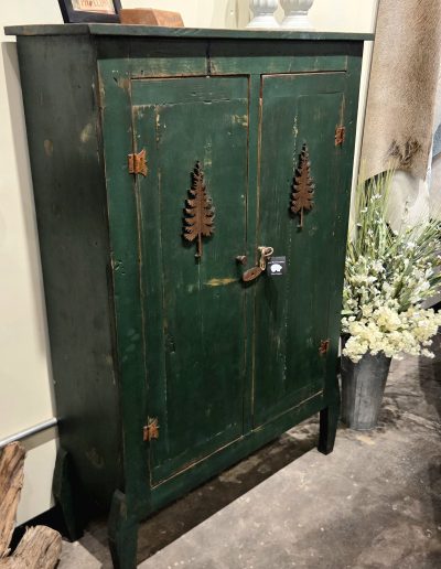 These character-filled, solid wood cabinets feature a distressed look with nature themes. Each piece is truly one-of-a-kind, antiqued to a perfectly imperfect finish. Spacious storage inside to hide your blankets, clothes or whatever you need to keep out of sight in style.