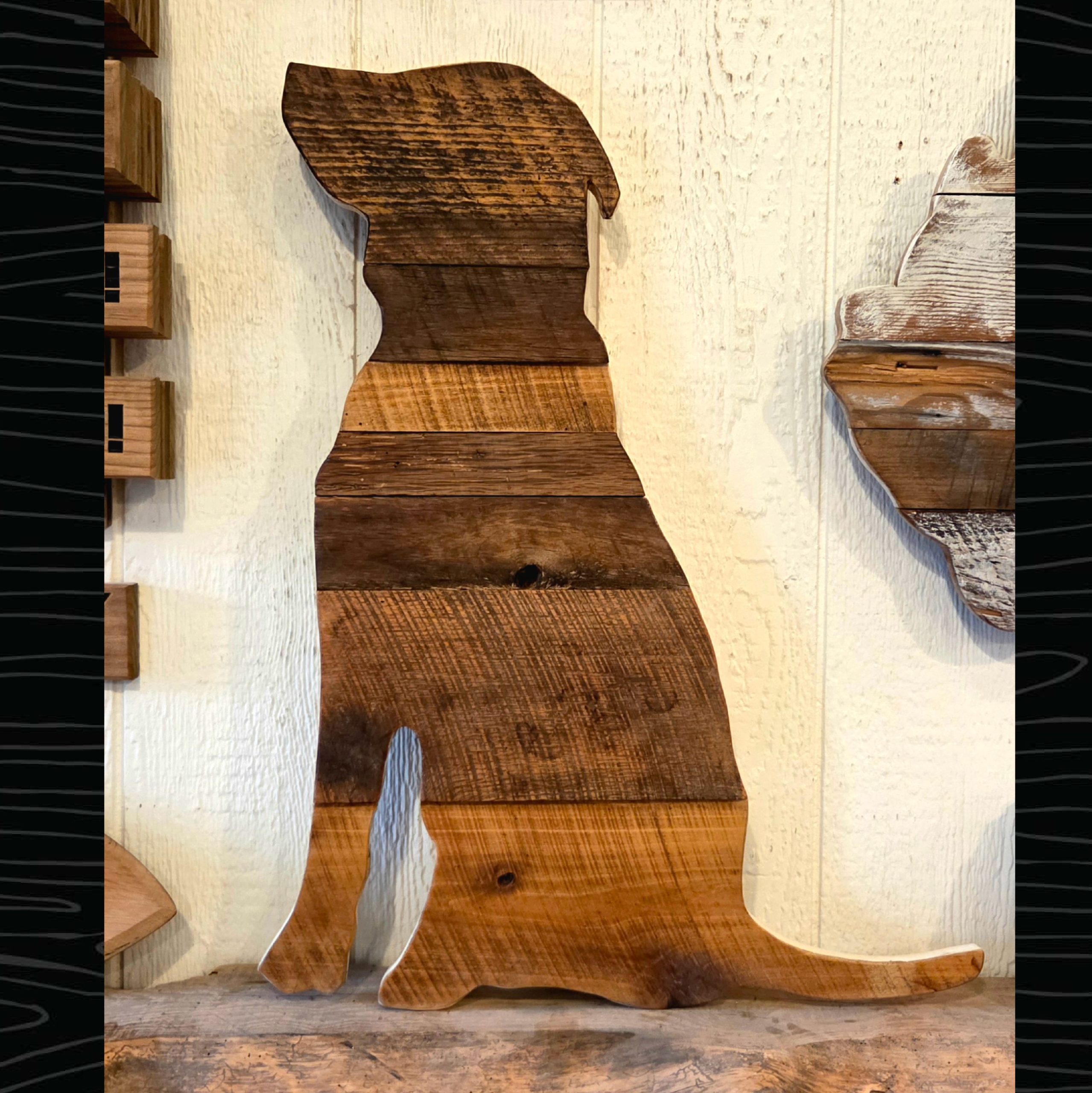 Bears! Dogs! Fish! Each is a one-of-a-kind work of art handmade using 100% locally reclaimed wood. Approximately 24″ – 32″ depending on the design. Photos are examples. No two are alike!