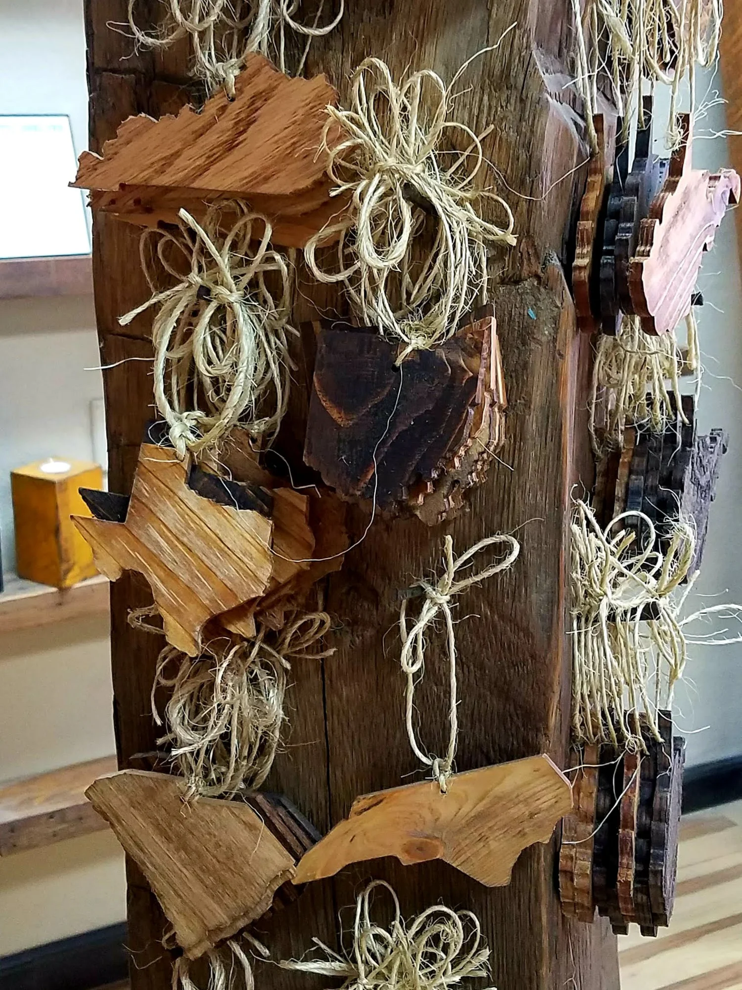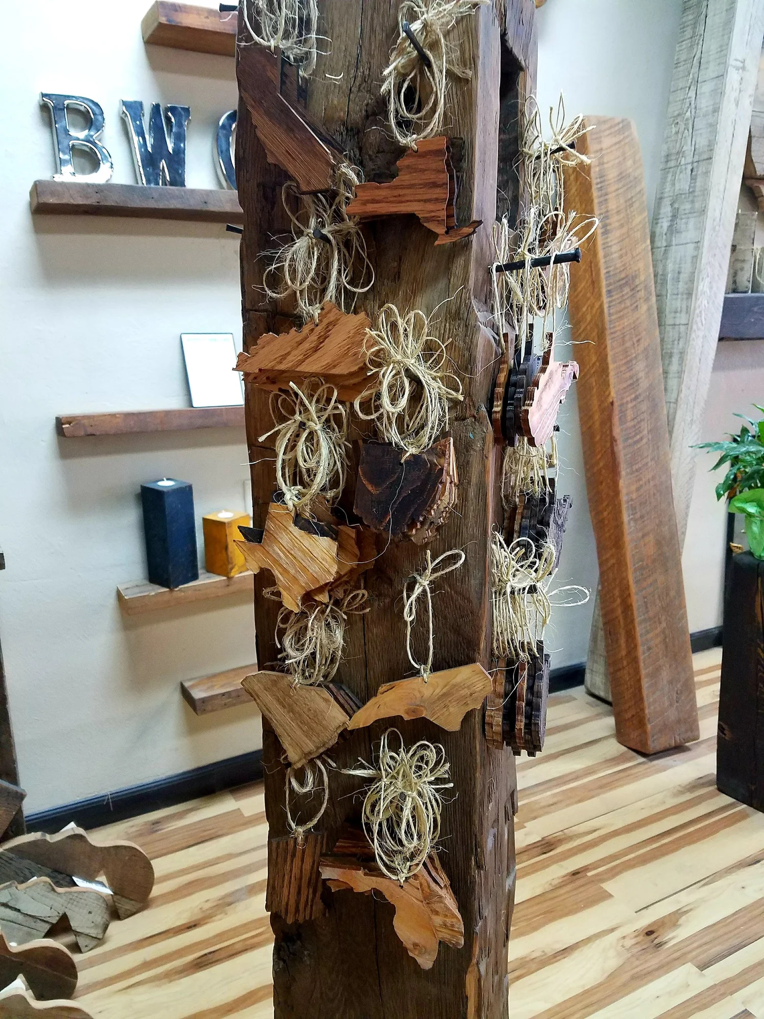Crafted from locally harvested reclaimed wood, these state outline ornaments combine sustainability with unique charm. Perfect for adding a personal touch to your decor or gifting to loved ones. Hang them as they are or paint them to make your own one of a kind work of art!