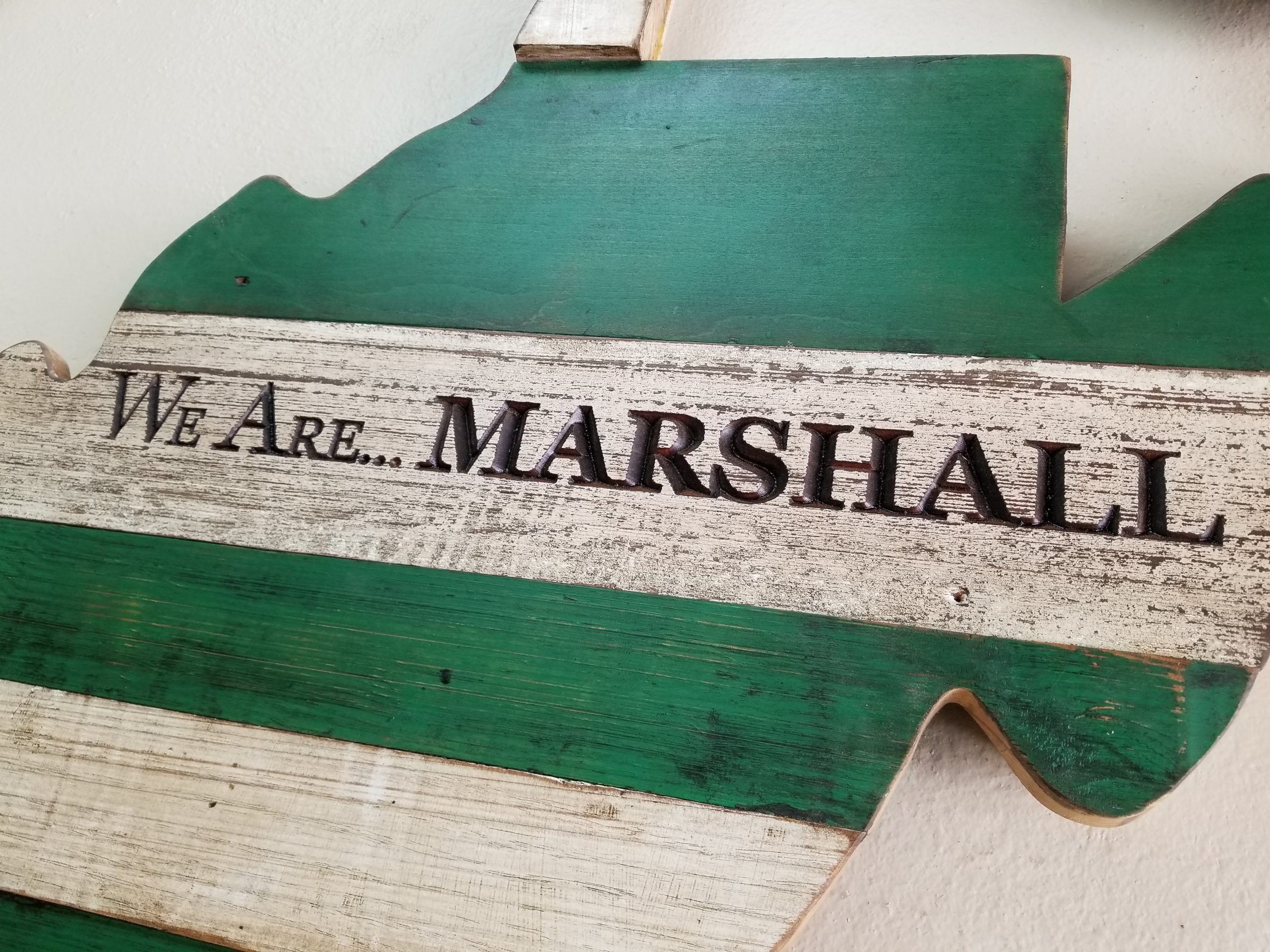 Show your Marshall pride and bring a piece of history home with our handmade reclaimed wood state, green and white style! Each piece is uniquely crafted from century-old wood salvaged from historic American barns, preserving the natural weathering, nail holes, and authentic textures that only time can create, and then we add that green and white charm.