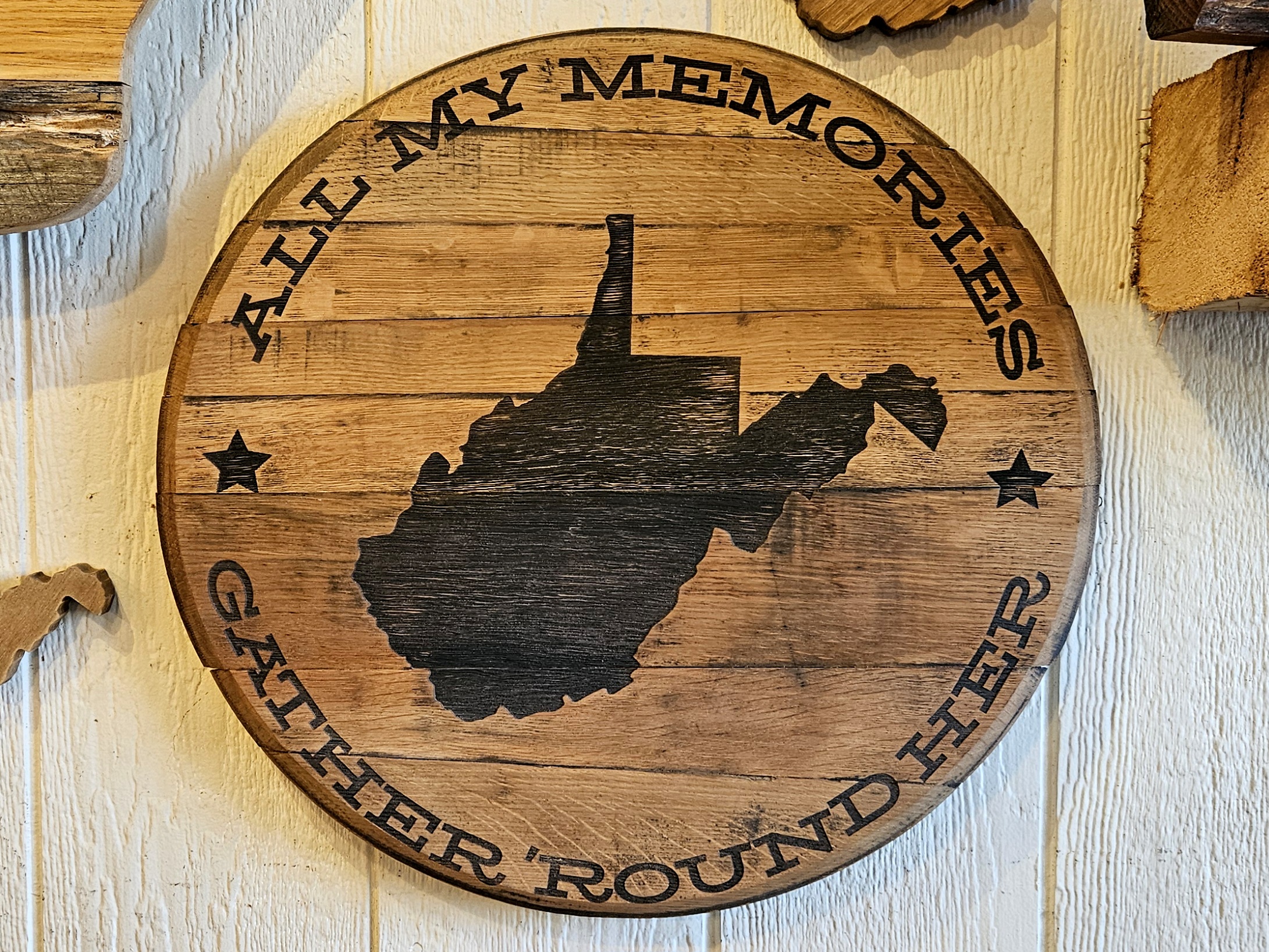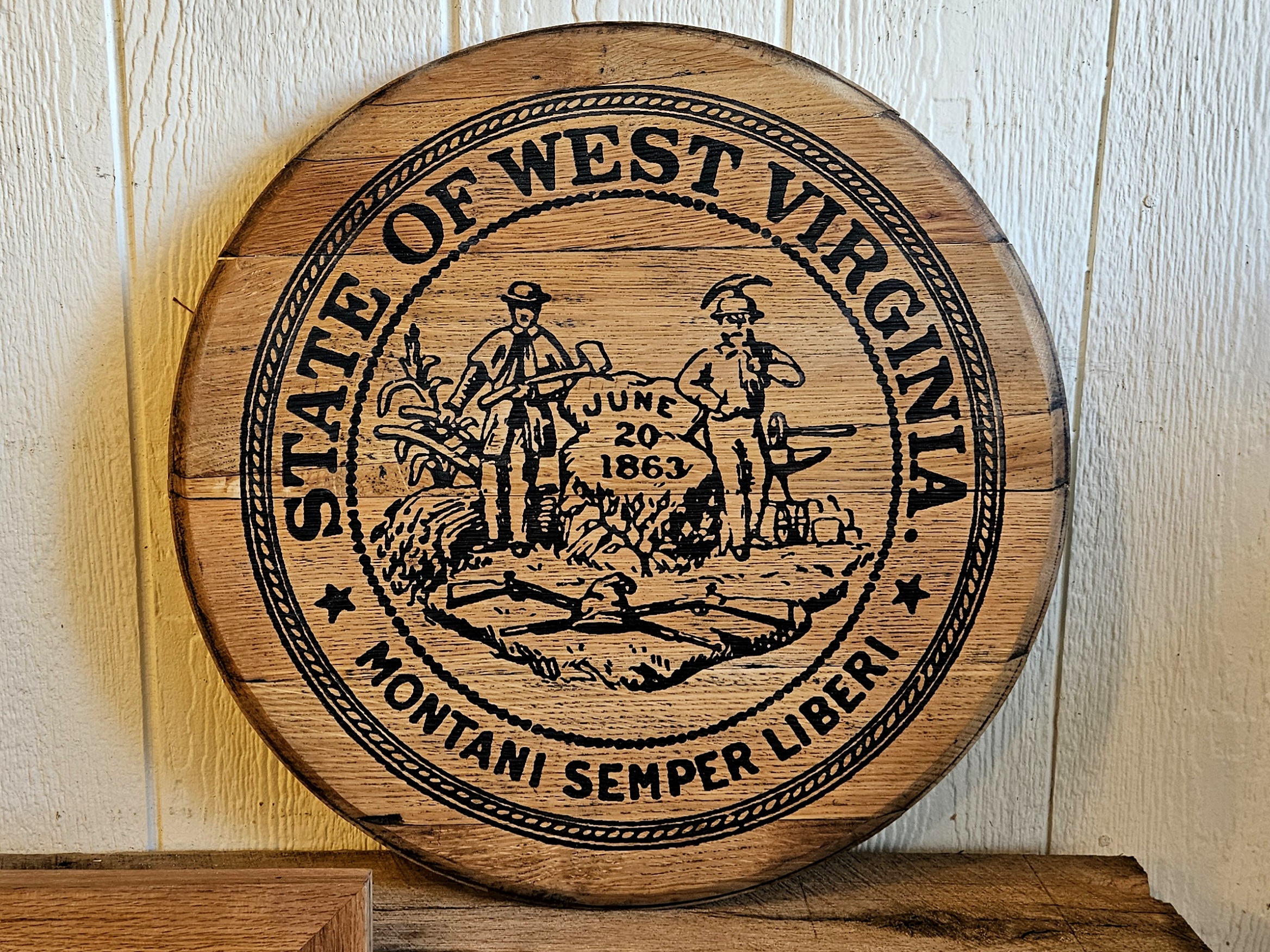These 100% genuine oak barrel lids were used in the process to carefully age bourbon. It’s during that process that they achieve the look and character that we seek. We remove the char that’s used to flavor the spirits and then sand them just enough to retain the character they’ve earned over time. The engraving is produced by laser as the image is burned across the lid’s face and a wire is installed on the back for hanging.