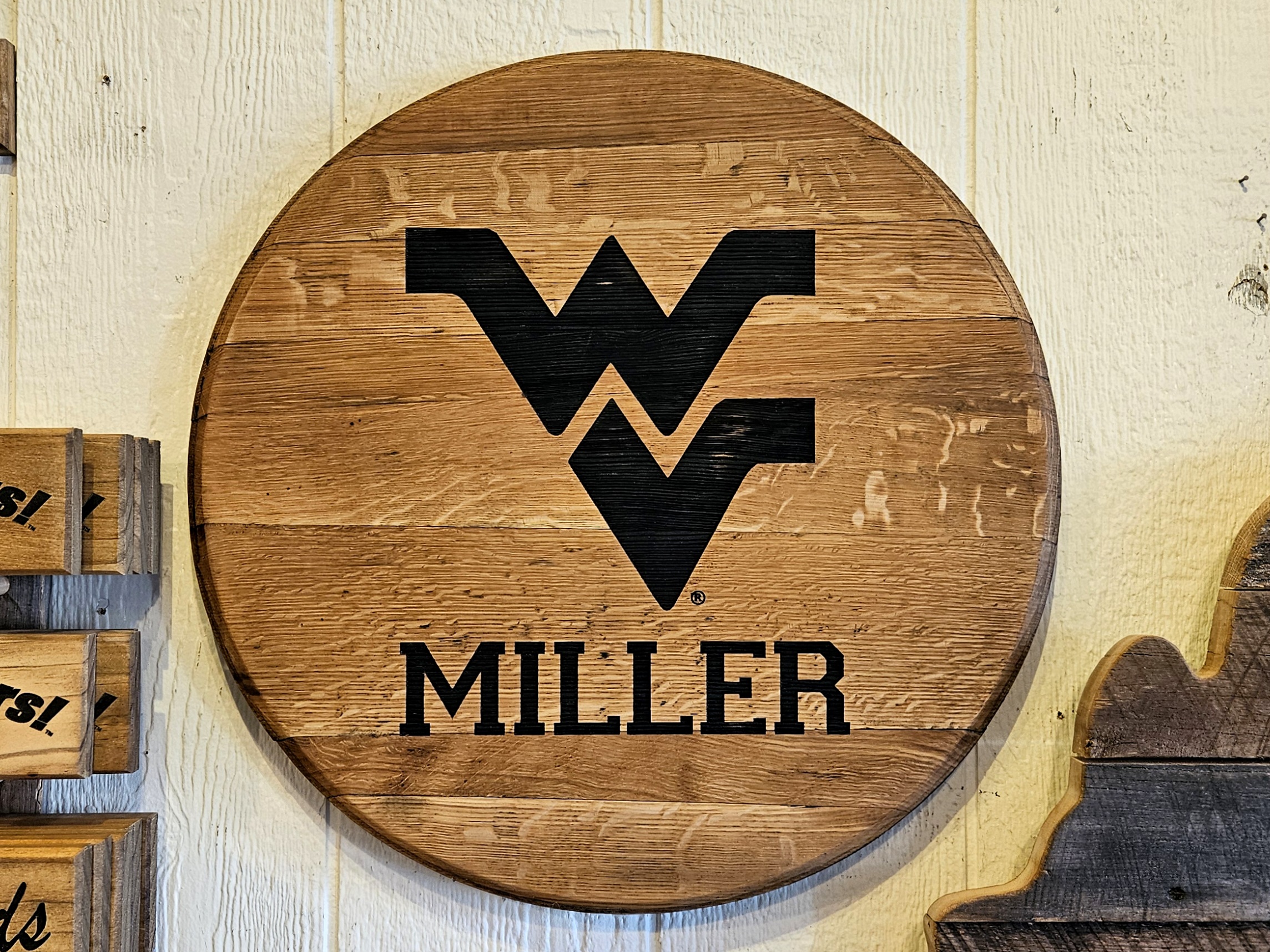 Show your school pride by engraving your name along with the West Virginia University Flying WV Logo on a 100% genuine reclaimed bourbon barrel lid! BWC is proud to offer you our exclusive WVU Personalization Program.